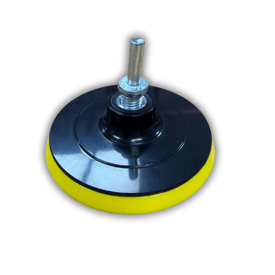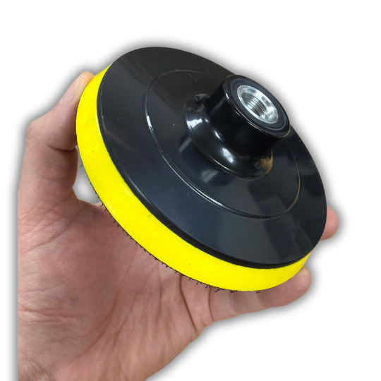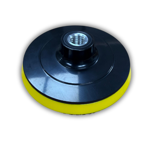 "Base Velcro 4,5'' con perno M14, compatible con esmeril angular y taladro. Ideal para fijar discos abrasivos de manera rápida y segura, ofreciendo mayor eficiencia en trabajos de lijado y pulido.