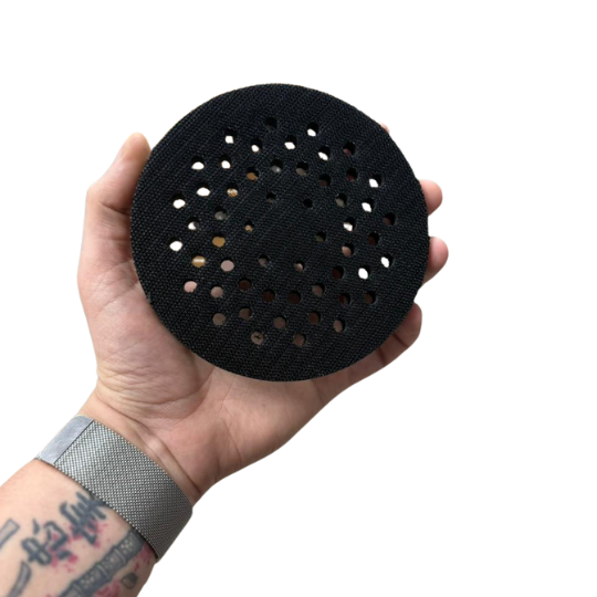 Interfase de 5 pulgadas con velcro y perforaciones para lijadoras orbitales. Mejora la amortiguación y el acabado, permitiendo un lijado más uniforme en superficies curvas y una óptima aspiración del polvo.
